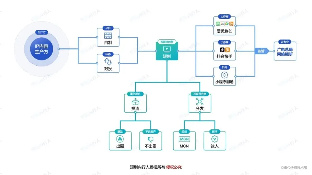 如果这部剧在上线投放的过程中涉嫌违规,就会迎来广电总局的监管即下架或者封杀,同样证监会在监控每只股票的买入卖出时也会监管股市参与者。当这部剧爆款出圈后,就会有多家CPS平台来承接他的转售,也就是互联网券商去代销各大券商优质理财产品。当然,这部剧上线就扑街的话,那他就是我们金融行业里面所谓的不良资产。好了,短剧行业对标金融业的角色,暂时普及到此。