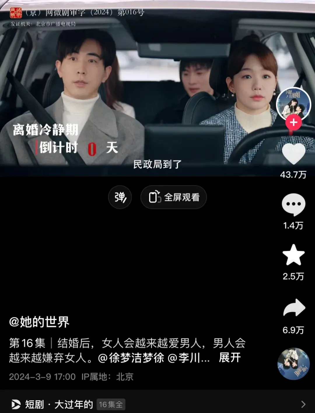 说实话,虽然当下微短剧内容很热,但对于整体观众来说,其仍属于小众观看模式。所以说,即使该作品是短剧赛道的爆款,但于大多数观众而言,仍鲜为人知。当然,即使爆款短剧在业内获得了大多数同行的认可,但能否破圈,最终还要看项目的播放数据、内容选题与投放周期,诸如《二十九》之所以能成为爆款,则与柠萌影业做长剧项目的类型一致,就像咪蒙操刀短剧一样,专耕自己擅长的领域,而完美旗下的《大过年的》,更是在“过年团聚”和“夫妻离婚”两个话题之间,找到了合适的平衡点,最终收获了10亿+播放量的成绩。