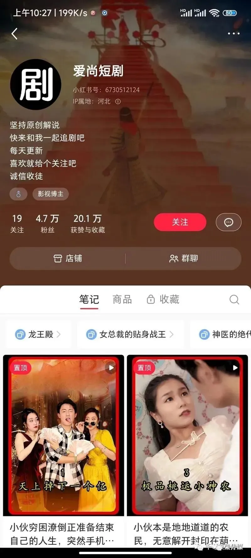 最近短剧在小红书上面流量涨粉的特别快。我去打听了一下,原来短剧板块博主有流量加成,可能小红书也有短剧这块的布局。这是其中的一个号,变现的很隐秘,也很暴力。我问了做这块的朋友,一晚上变现10w左右。