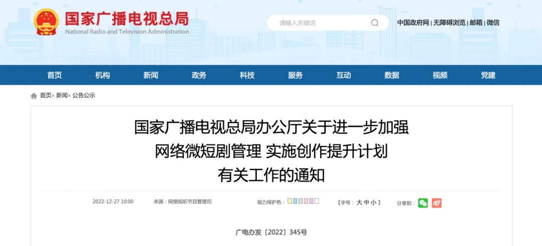 2022年12月27日,为引导网络微短剧规范有序发展,国家广播电视总局就已经发布了《关于进一步加强网络微短剧管理,实施创作提升计划有关工作》的通知,其中指出,要严肃、扎实开展“小程序”类网络微短剧专项整治。