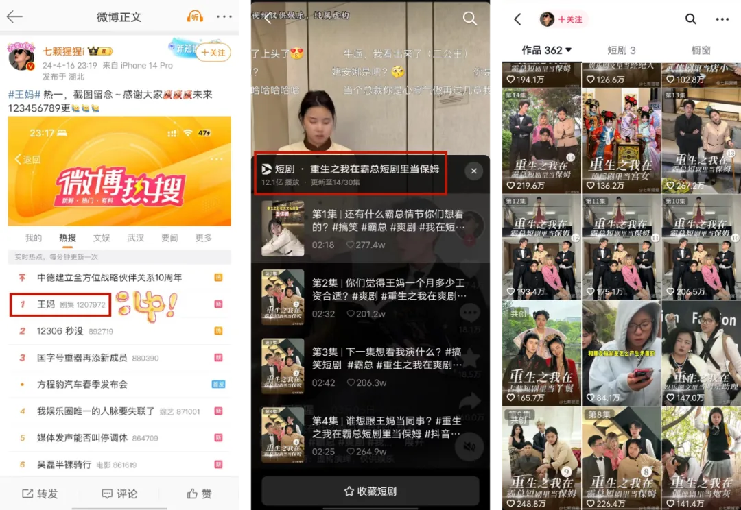 4月16日,抖音千万粉博主“七颗猩猩”靠拍《重生之我在霸总短剧里当保姆》火出圈,话题“王妈”登上微博热搜第一。截止发稿前,该短剧系列已更新14集,播放量达12.1亿。