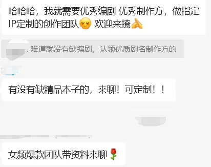 在一些短剧社群,经常出现这样一幕:一边是编剧在推销自家剧本,另一边是短剧制作公司寻觅优质剧本。编剧和制作公司互为供需方,彼此之间频繁交流合作机会。