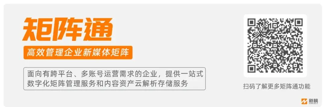 • 作为数据驱动的互联网内容科技公司,新榜提供新媒体内容营销和企业服务系列产品,助力中国企业数字化内容资产获取与管理,服务于内容产业,以内容服务产业。• 我们的客户既包括腾讯、字节跳动、阿里巴巴、中国平安、比亚迪、京东、通威、贝壳、宝洁、欧莱雅、联合利华、雅诗兰黛、迪士尼等头部品牌,也包括正在蓬勃成长的中小企业、新兴品牌和MCN机构。面向企业的内容化组织建设,新榜提供从公域流量募集分发到私域内容运营建设的各项所需。• “新媒体,找新榜”是我们的使命。凭借全面稳定的新媒体内容数据产品和企业服务能力,新榜被评为国家级高新技术企业、上海市专精特新企业、上海数字广告领军企业,曾荣获“全国内容科技创新创业大赛一等奖” 、“上海文化企业十佳”、“中国广告新媒体贡献年度大奖”等称号,拥有多个传播评估监测专利。浏览器搜索新榜官网,获取更多新媒体动向。