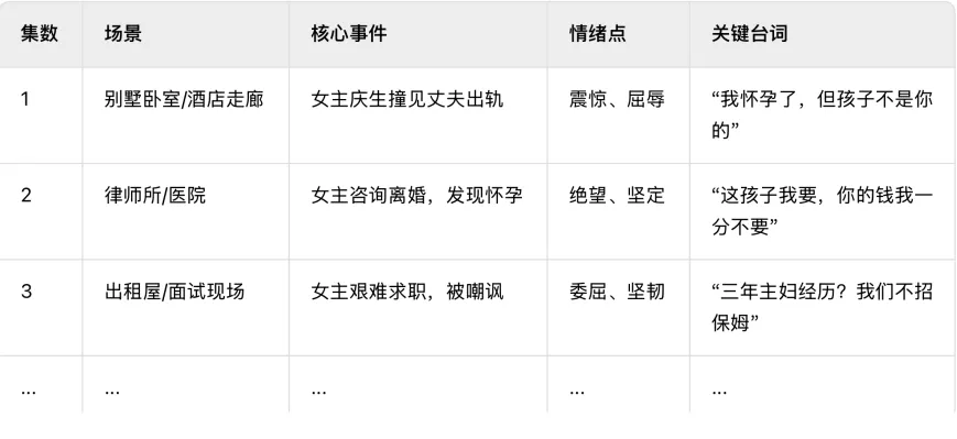 集数/时长/主场景/AB故事/情绪曲线/关键动作/结尾钩子/预算备注