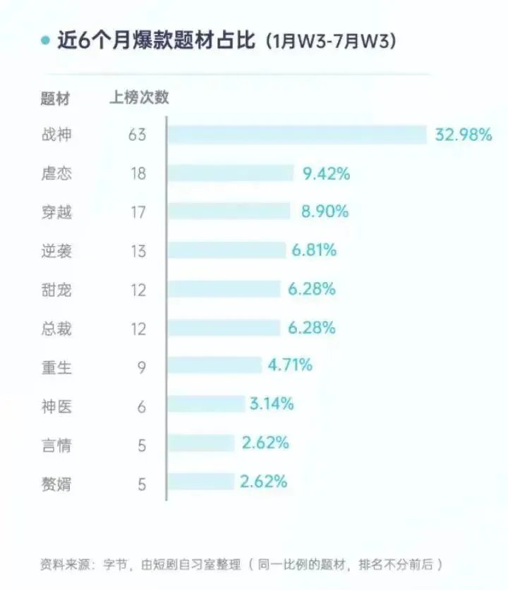 短剧行业人士透露,目前下沉市场的付费用户比较多,短剧的爽感满足了人性的某一方面需求,对于一些战神、霸道总裁、逆袭的题材尤为感兴趣;除了目前已经成熟的题材外,一些鉴宝、太子、太监、经商、民国题材的出爆款率也很高,未来空间巨大。(当然有一些题材价值观过于扭曲,已被平台逐步封禁,详情可以自行搜索“短剧内容治理