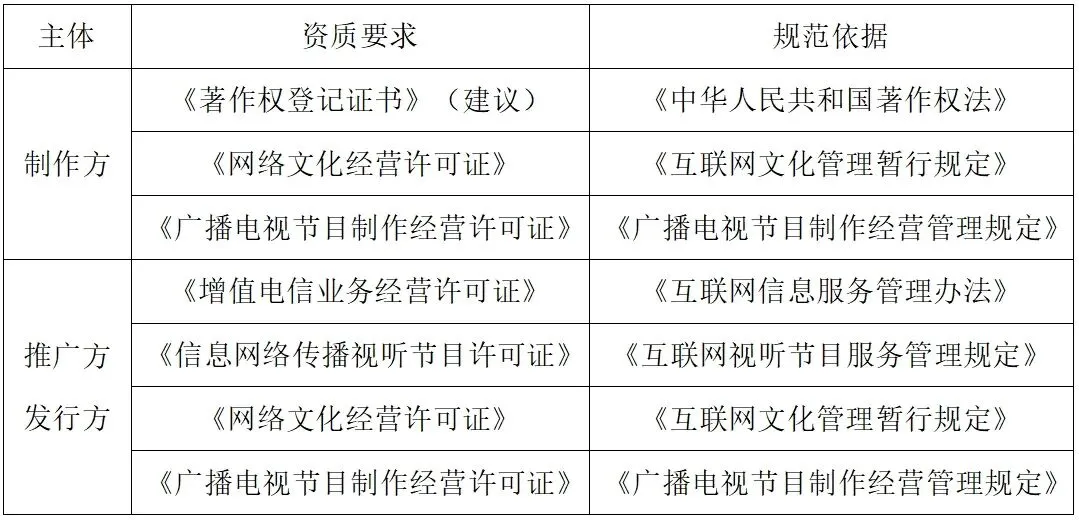 短剧不同阶段需要注意的资质问题不同,从事微短剧制作、传播、平台等业务,所涉及应取得的主要资质牌照汇总如下: