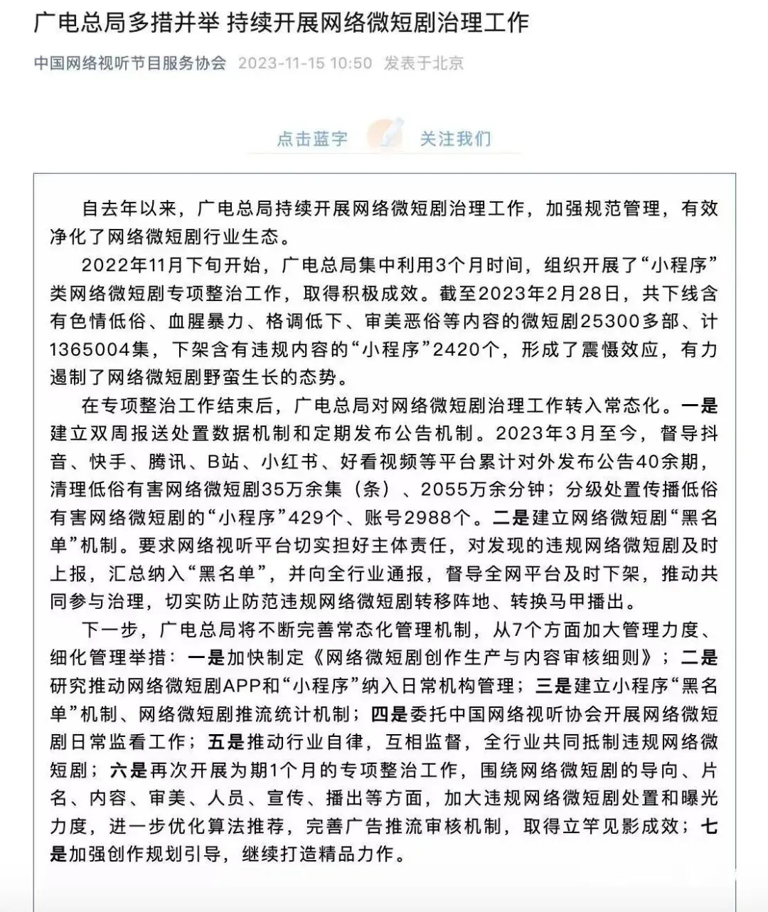 11月15日,中国网络视听节目服务协会发布消息称,自去年以来,广电总局持续开展网络微短剧治理工作,加强规范管理,有效净化了网络微短剧行业生态。