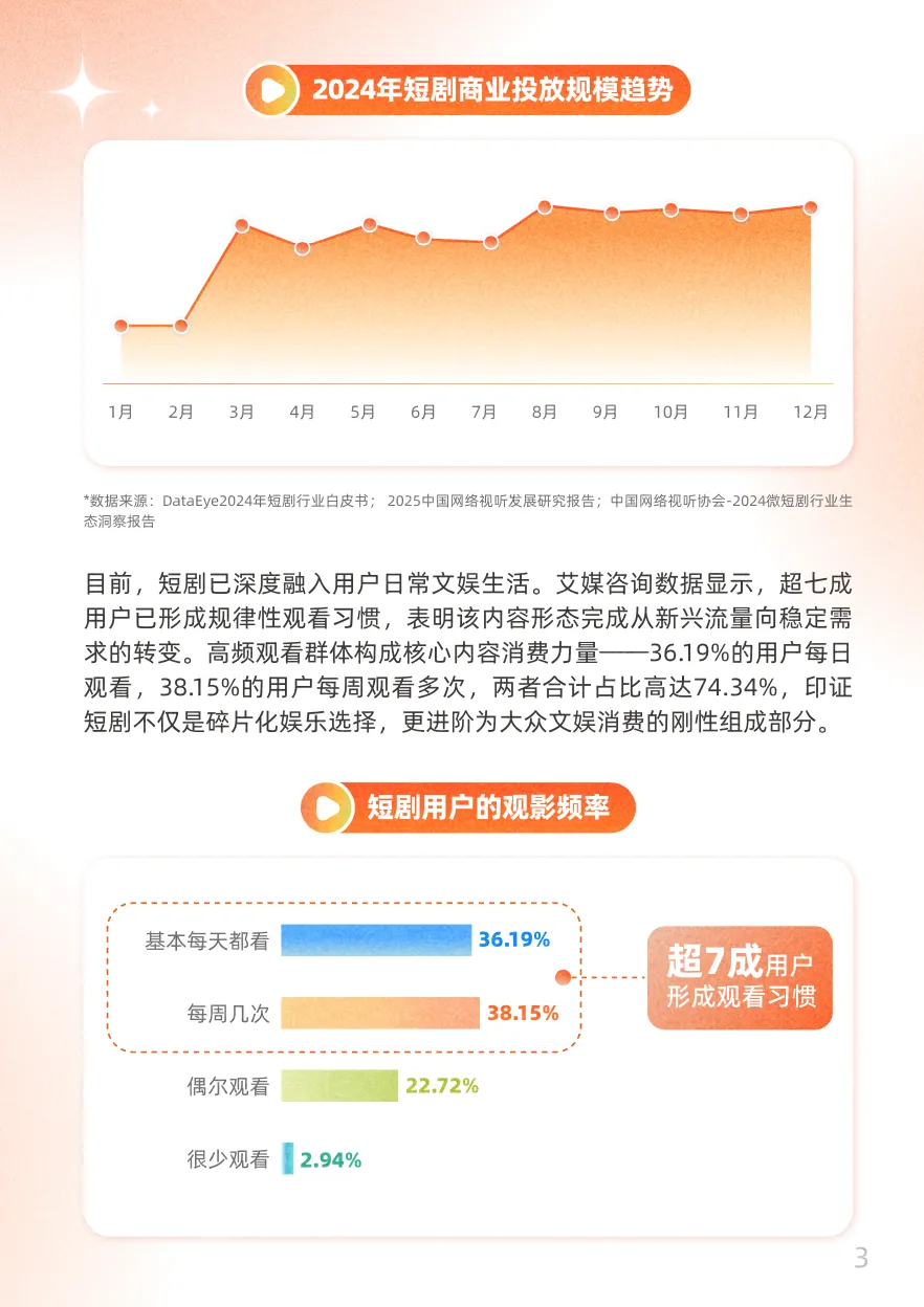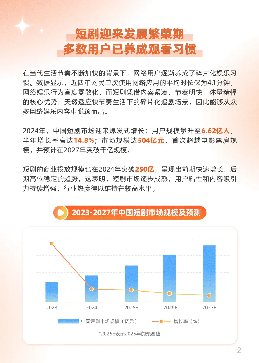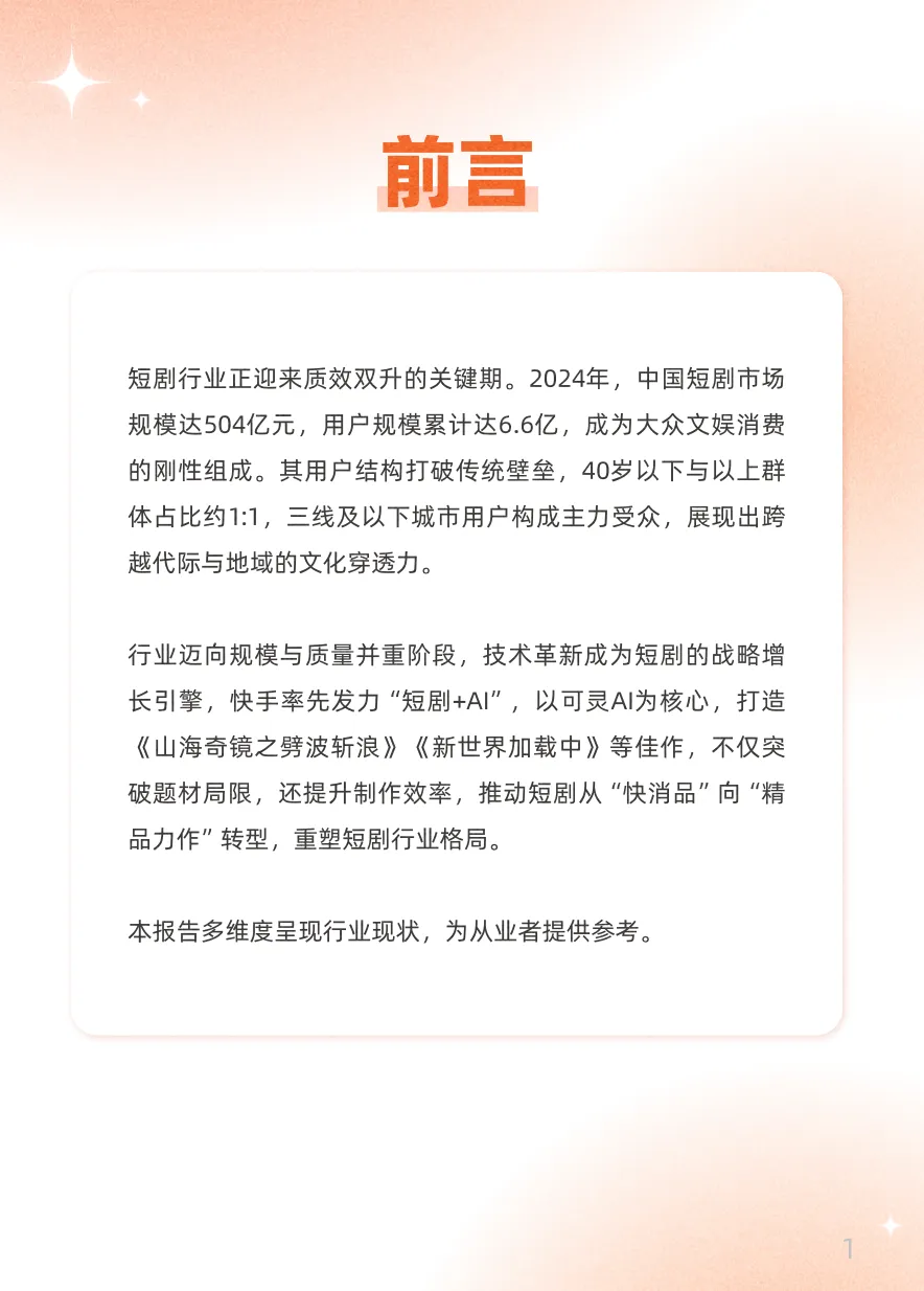 #短剧行业 正迎来质效双升的关键期。2024年,中国#短剧市场 规模达504亿元,用户规模累计达6.6亿,成为大众文娱消费的刚性组成。其用户结构打破传统壁垒,40岁以下与以上群体占比约1:1,三线及以下城市用户构成主力受众,展现出跨越代际与地域的文化穿透力。