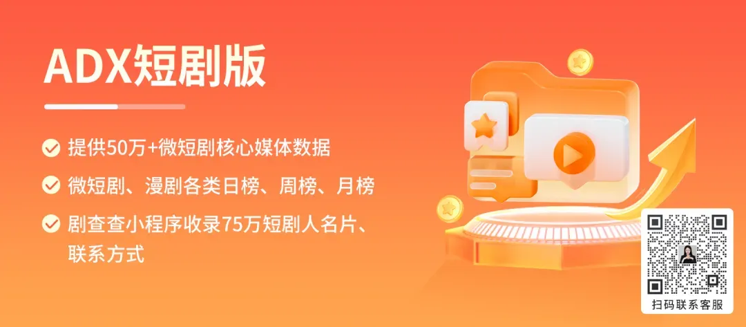 剧查查小程序汇聚75万用户,囊括5000+公司,您可查看抖音快手热播榜、热力值数据,以及红果热榜、演员榜、品牌短剧榜、小说榜,还可在【社区】发布或对接需求,在【服务】里查询微短剧详情、企业、从业者联系方式,同时可参加抖音星图任务赚零花钱,佣金最高90%。更多素材、榜单数据,可以联系我们,免费试用ADXray行业版,掌握一手微短剧数据。ADXray行业版,能实时监控全网最新、最火的微短剧广告数据,为从业者提供全平台、多维度的数据洞察、素材策略参考,助您第一时间掌握行业趋势,提升投放效果!↑关注公众号,回复:试用 ,即可免费试用ADXray行业版。