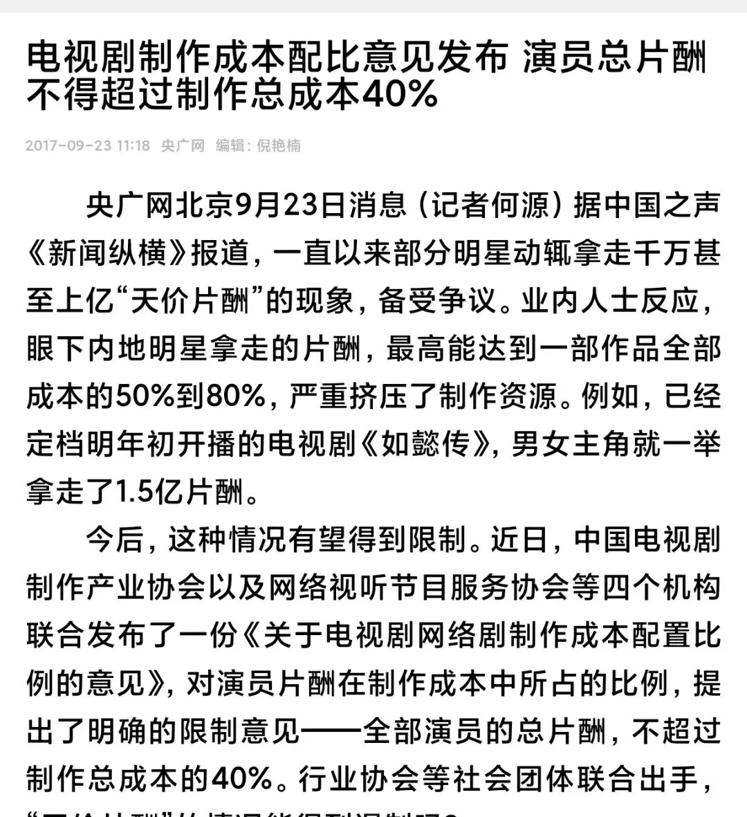 演员成本的高占比有着明确的行业依据与政策边界。早在2017年,中国广播电影电视社会组织联合会等四大协会联合发布《关于电视剧网络剧制作成本配置比例的意见》,明确规定全部演员总片酬不超过制作总成本的40%,主演片酬不超过总片酬的70%。