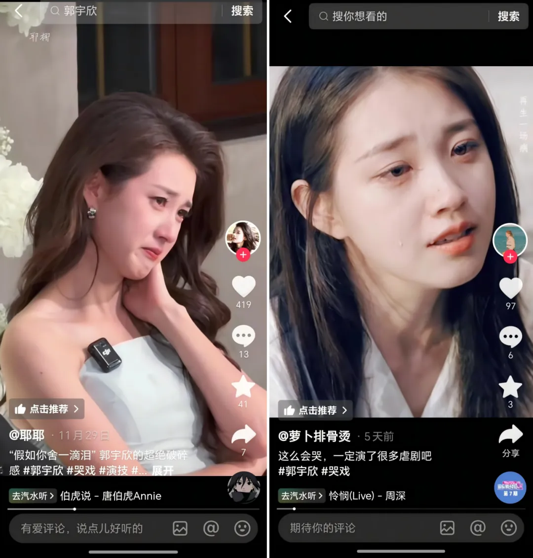值得一提的是,其中的女主角郭宇欣毕业于中央戏剧学院,剧中一幕背对镜头的浴室哭戏,没有夸张嘶吼,仅凭肩部细微抽动和压抑的呼吸节奏,就将角色挣扎刻画得入木三分。这段表演在抖音被二次创作传播,有观众表示“看完哭了十分钟”,被称为是 “教科书”级别的哭戏。