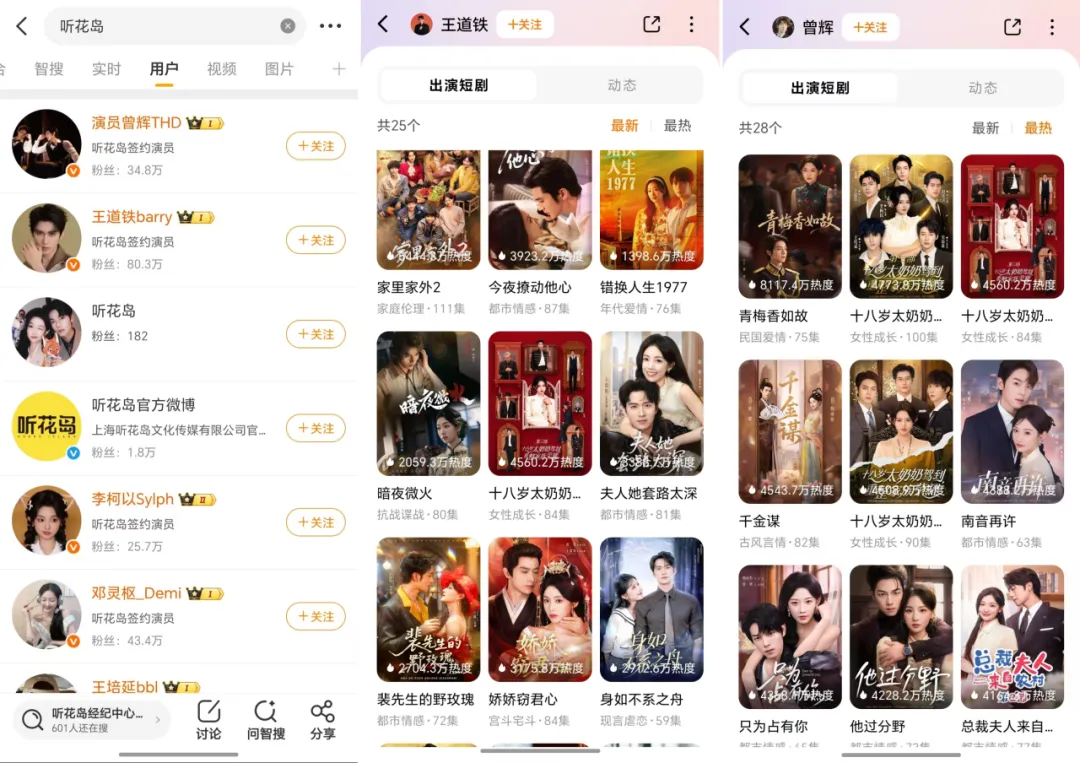 行业内部结构也在发生深刻变化。越来越多的短剧演员开始签约正规影视公司,实现职业化转型。听花岛等头部制作方签约王道铁、曾辉等演员,打造“以人带剧”的闭环模式。