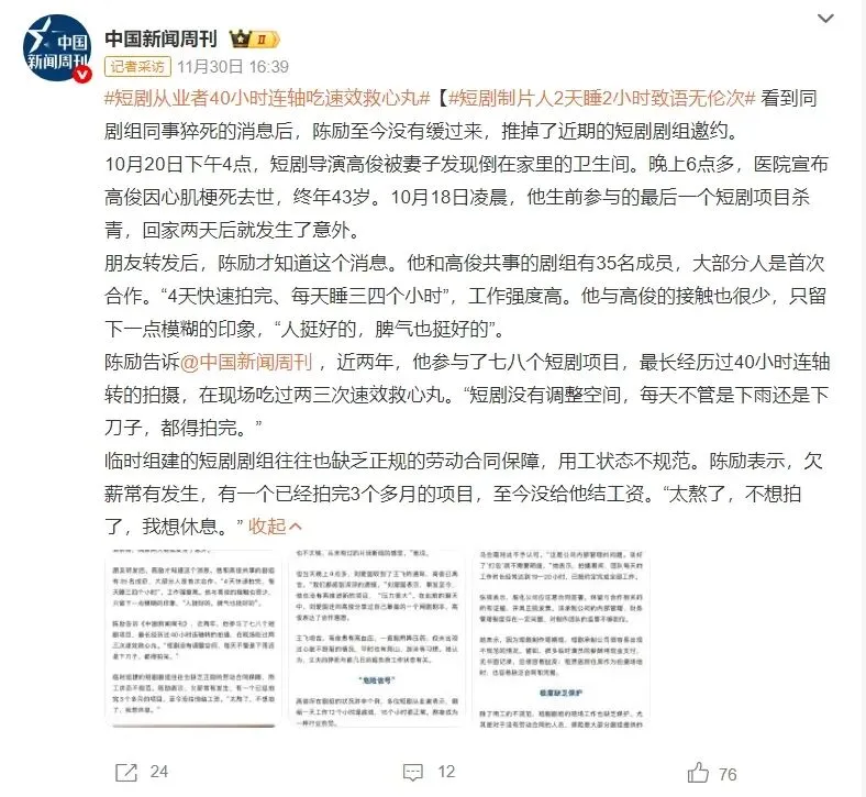 类似的事件,在短剧行业已不是第一次发生:短剧女王徐艺真曾表示自己每天工作18~20个小时,演员邓友在社交平台上透露仅他认识的人中,过去一年就有5人因短剧的高强度工作而猝死。而直到高俊导演的突然猝死引起了较大关注,外界才得以窥探到这些残酷的真实。