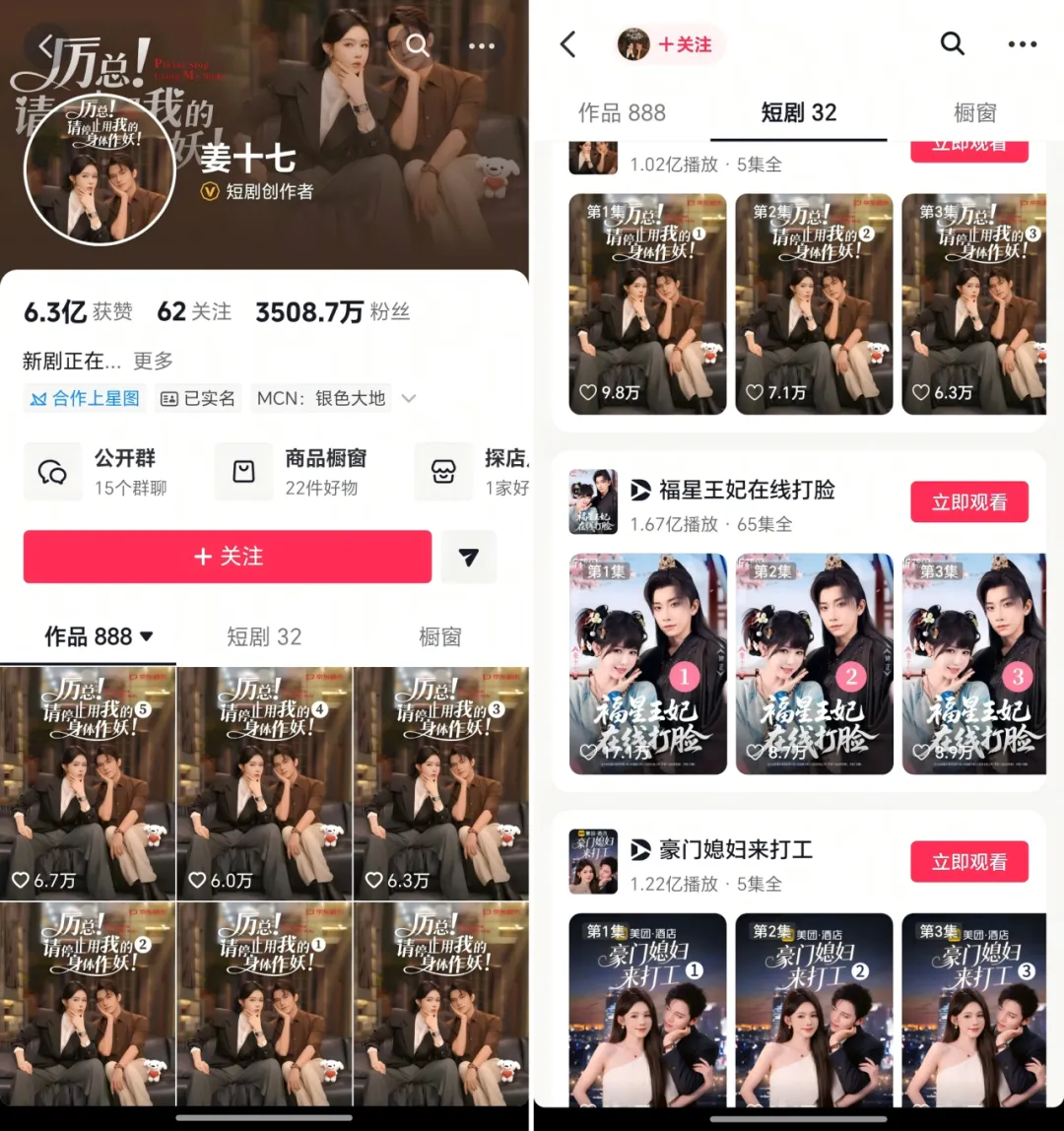 时机对于演员的重要性不言而喻,如今要盘点短剧女演员,不管从粉丝量、作品数量、爆款作品等几个指标看最红火的都是出最早的那批。比如凭借《恶女的告白》一炮而红的姜十七,2019年就以剧情博主的身份活跃在抖音,如今已经积累了3500多万粉丝,去年她有6部短剧进入年度播放前十,在短剧界断层第一。