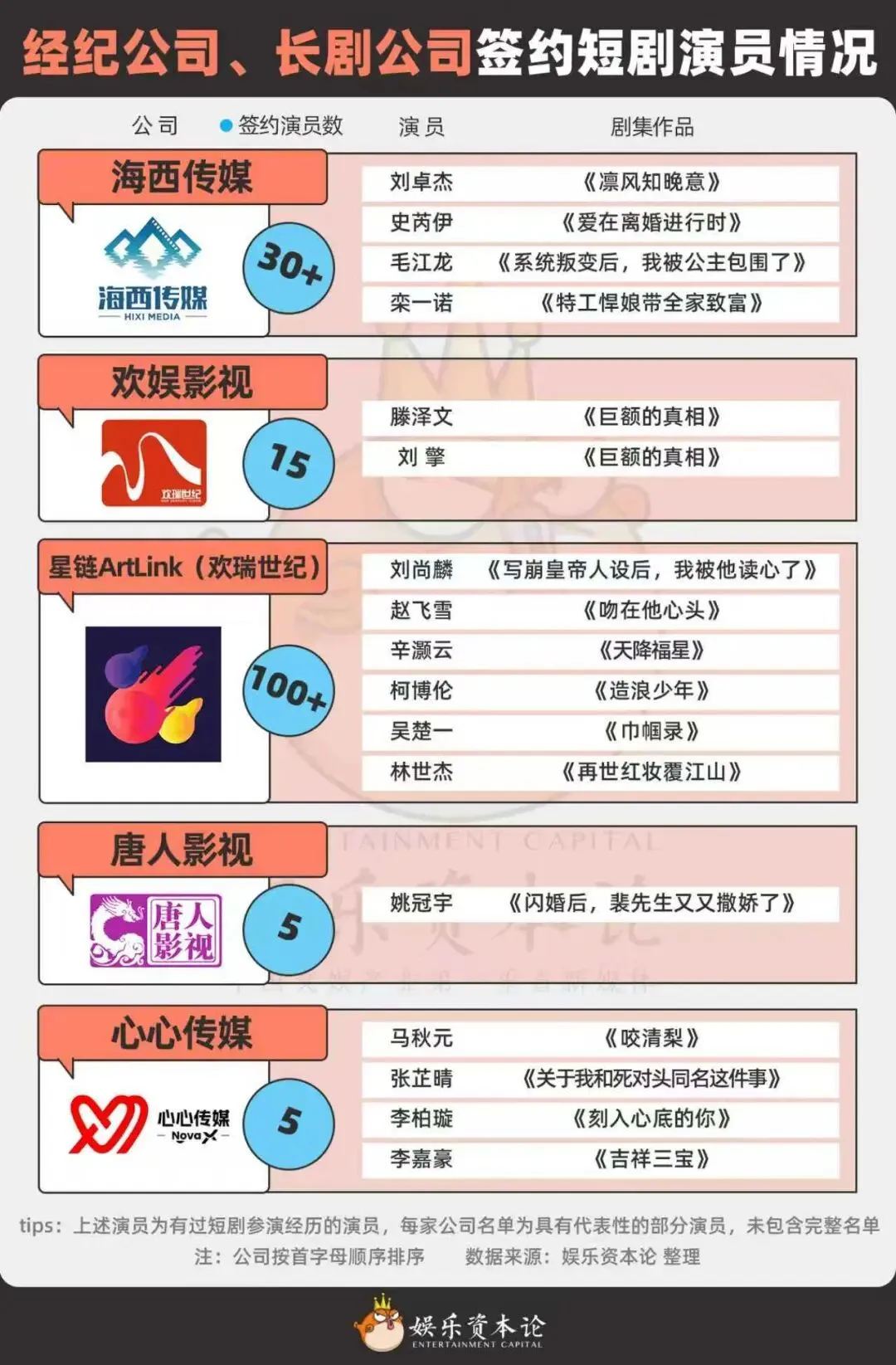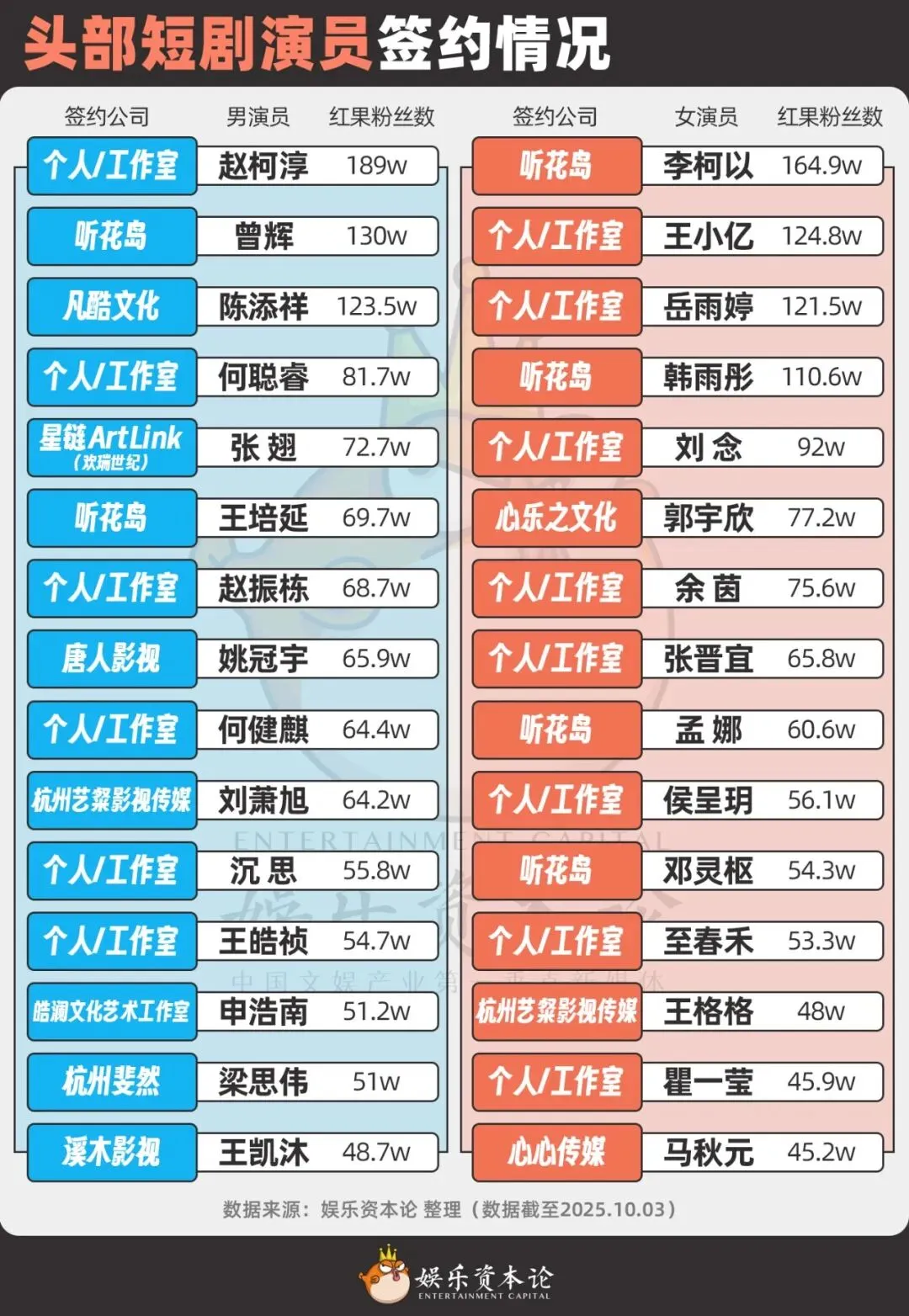 在娱乐资本论统计的头部演员签约的情况中,50%的头部演员签约了公司,剩下50%多是自己建立了工作室,或以个人团队的方式在行业中扎根。