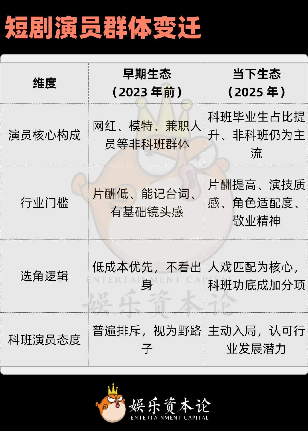 这种转变的背后,是短剧演员生态最鲜明的迭代,曾经 “非科班扎堆、科班瞧不上” 的格局,正被彻底改写。