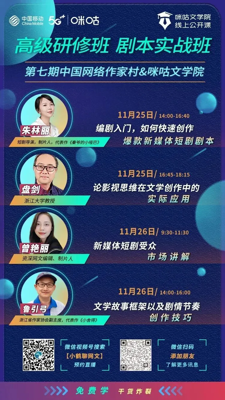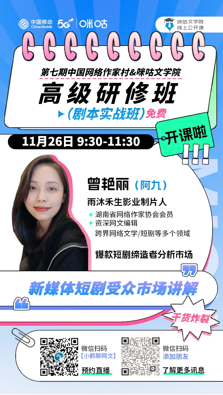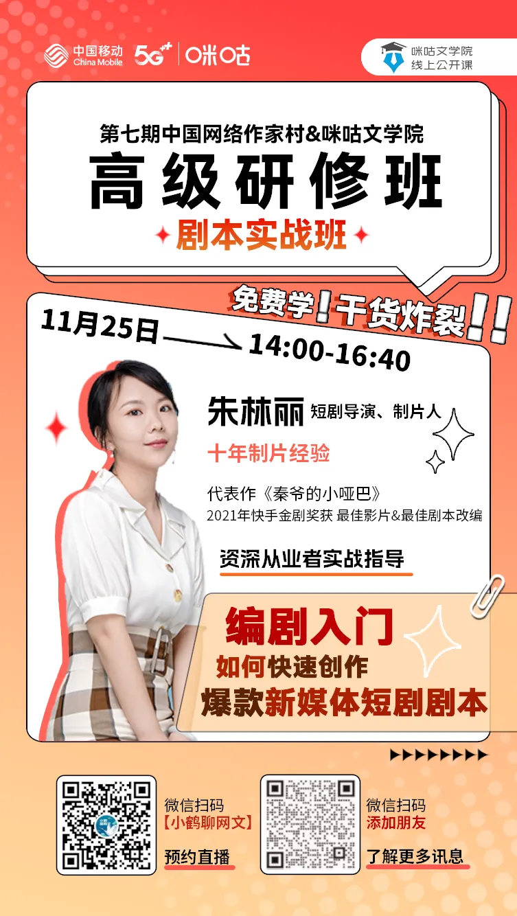 咪咕文学院高研班特别推出了“短剧实战班”,请来了多位影视界大佬带你入门短剧。目前线上学员正在火热召集中,就差你还没加入了~