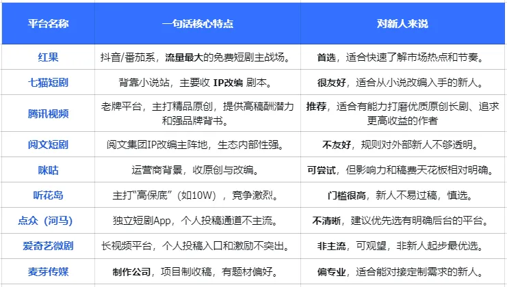 对新人来说,更关键的是怎么选。我自己的看法是,可以先从那些投稿路径最清晰、直接在后台操作、权益比较有保障的平台开始尝试。我目前主要关注的就是红果、七猫、腾讯视频和阅文这四个,它们各有各的调性。