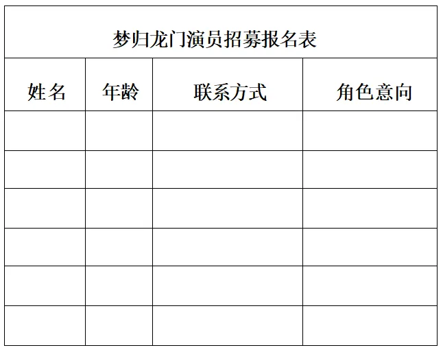 将个人简历(需填写姓名、年龄、联系方式、角色意向)发送至邮箱:lsxjlzzf@163.com,邮件主题需注明“《梦归龙门》演员招募+姓名+角色意向”(例:《梦归龙门》演员招募-张三-裴如梦)