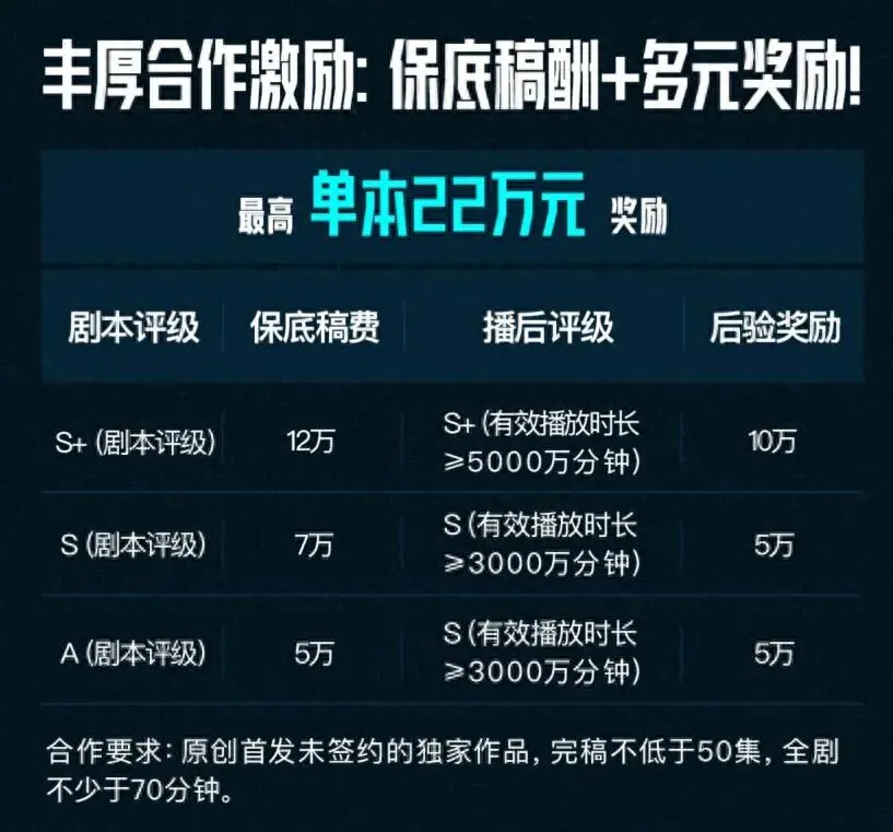 收益亮点预告:对于符合要求并通过评审的优质剧本,腾讯视频提供 “保底+奖励” 的合作模式。官方资料显示,单本剧本的最高合作金额可达 22万元。这为专业编剧提供了极具吸引力的回报预期。
