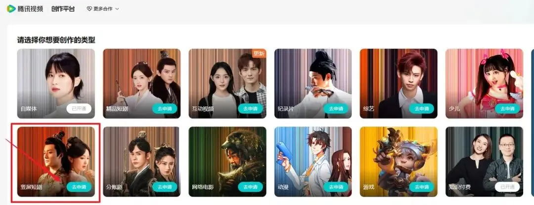 登录成功后,在平台内找到并申请 【竖屏短剧】 相关合作。