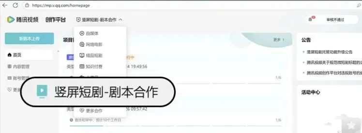 申请开通后,进入创作者后台。请注意找到页面左上角的 【切换】 功能按钮。点击后,在弹出的一系列选项中选择 【竖屏短剧-剧本合作】。这一步至关重要,它能帮助你精准进入专门的剧本投稿与管理模块,避免找错入口。