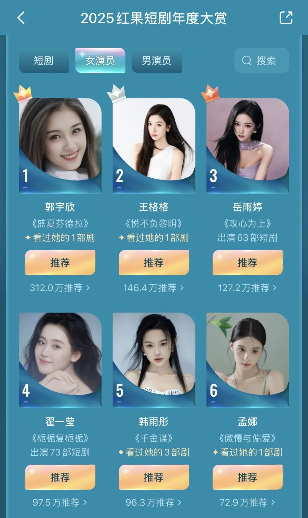 截至2025年12月30日,凭借三部“太奶奶”系列,主演李柯以成为红果短剧破30亿(3部)最多,粉丝量(245.1万)最多的女演员;一部《盛夏芬德拉》,让主演刘萧旭、郭宇欣一跃成为短剧顶流;曾辉和韩雨彤的“落日雨辉”CP,2025年有三部剧观看量均破10亿。