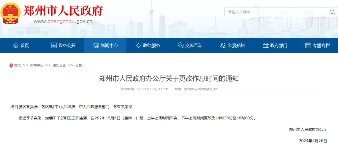 郑州市人民政府办公厅关于更改作息时间的通知:自2024年5月6日(星期一)起,上午上班时间不变,下午上班时间更改为14时30分至18时00分。