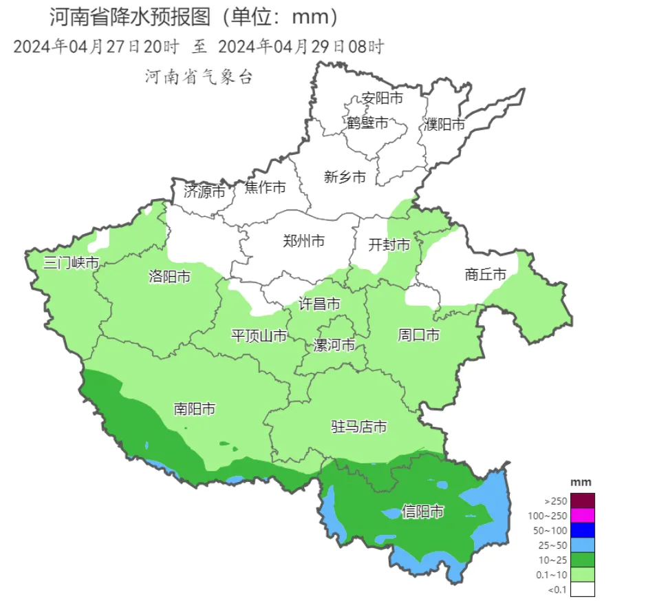 4月27日夜里至28日,河南黄河以南有一次对流性降水天气过程,南阳南部、信阳部分县市有中雨、局部大雨,并伴有雷暴大风、短时强降水等强对流天气。28日至30日,全省偏北风4到5级,阵风7级左右;29日至30日,北中部、南部部分县市还有分散性阵雨、雷阵雨。
