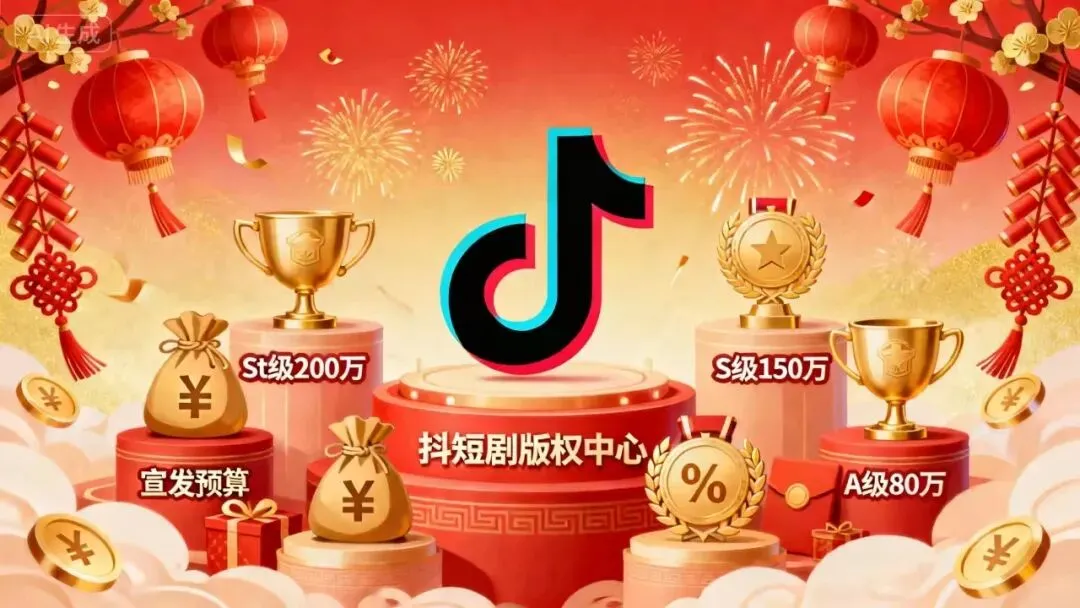 抖音短剧版权中心推出春节专项扶持计划。按项目等级给出丰厚保底激励:St级200万、S级150万、A级80万,宣发级剧目还能额外获得50-150万宣发预算。除此之外,还叠加了“收益达标额外分成、系列剧加成”等多重奖励,其中春节应景题材与优质IP改编作品将获得优先扶持,诚意满满。