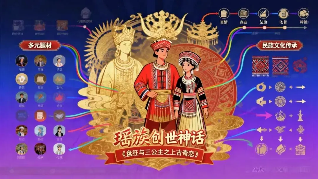民族题材方面,瑶族首部以本民族创世神话为内核的系列微短剧《盘王与三公主之上古奇恋》正式上线。