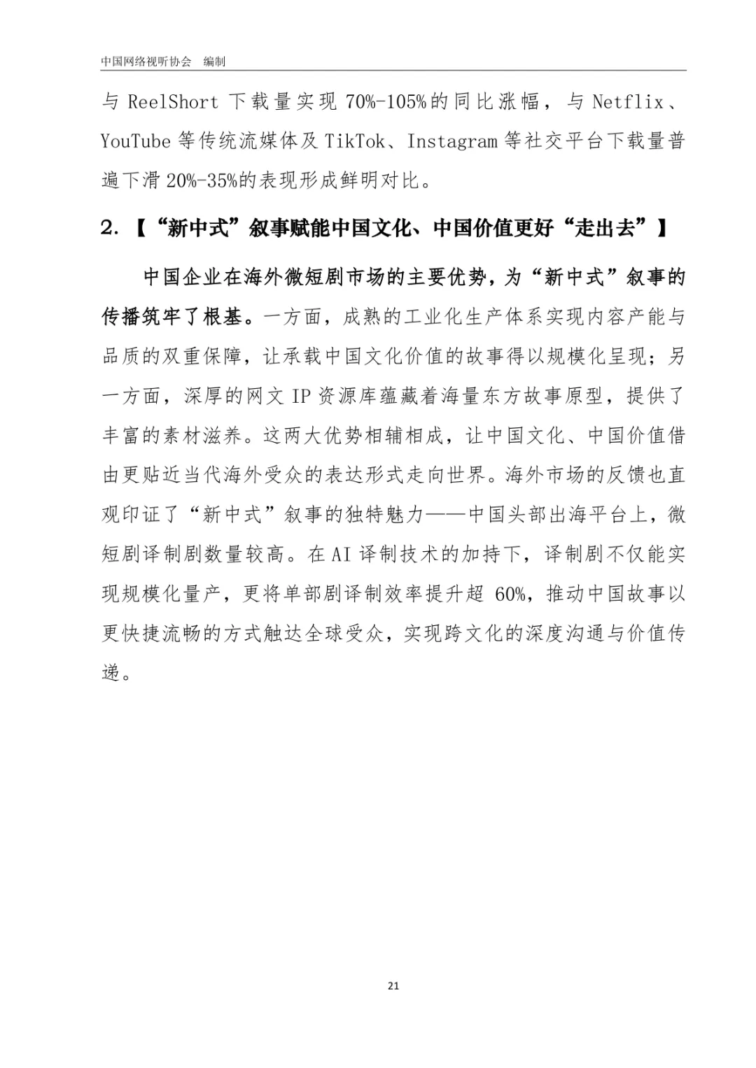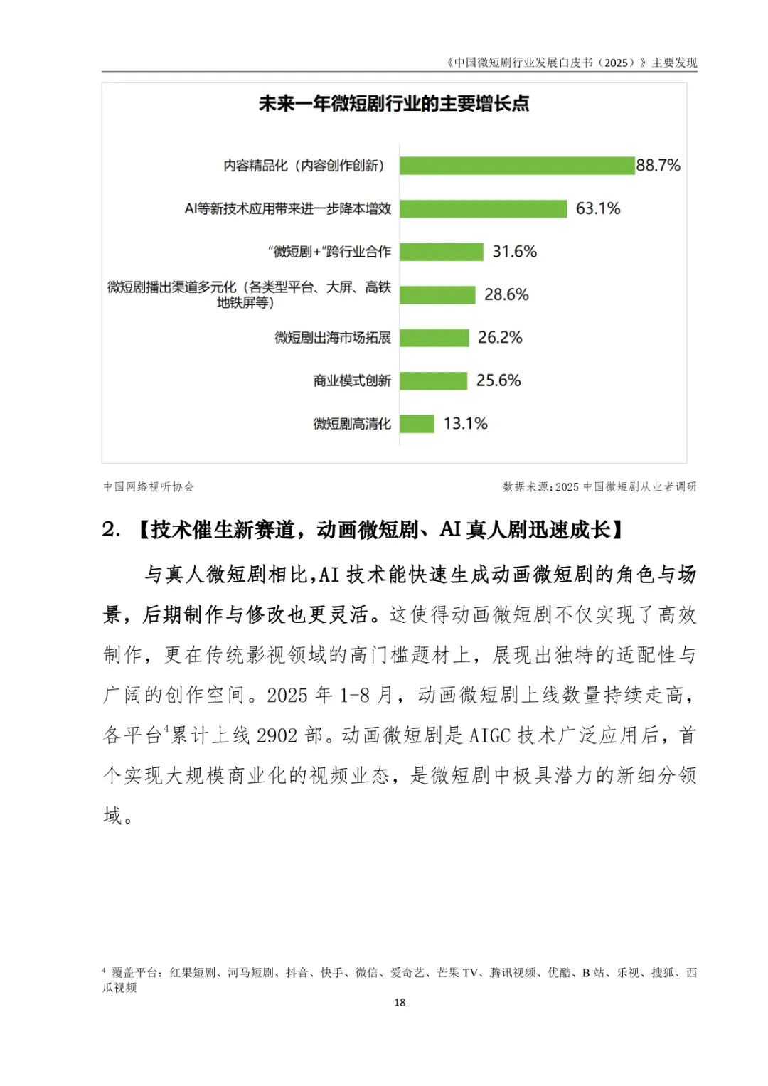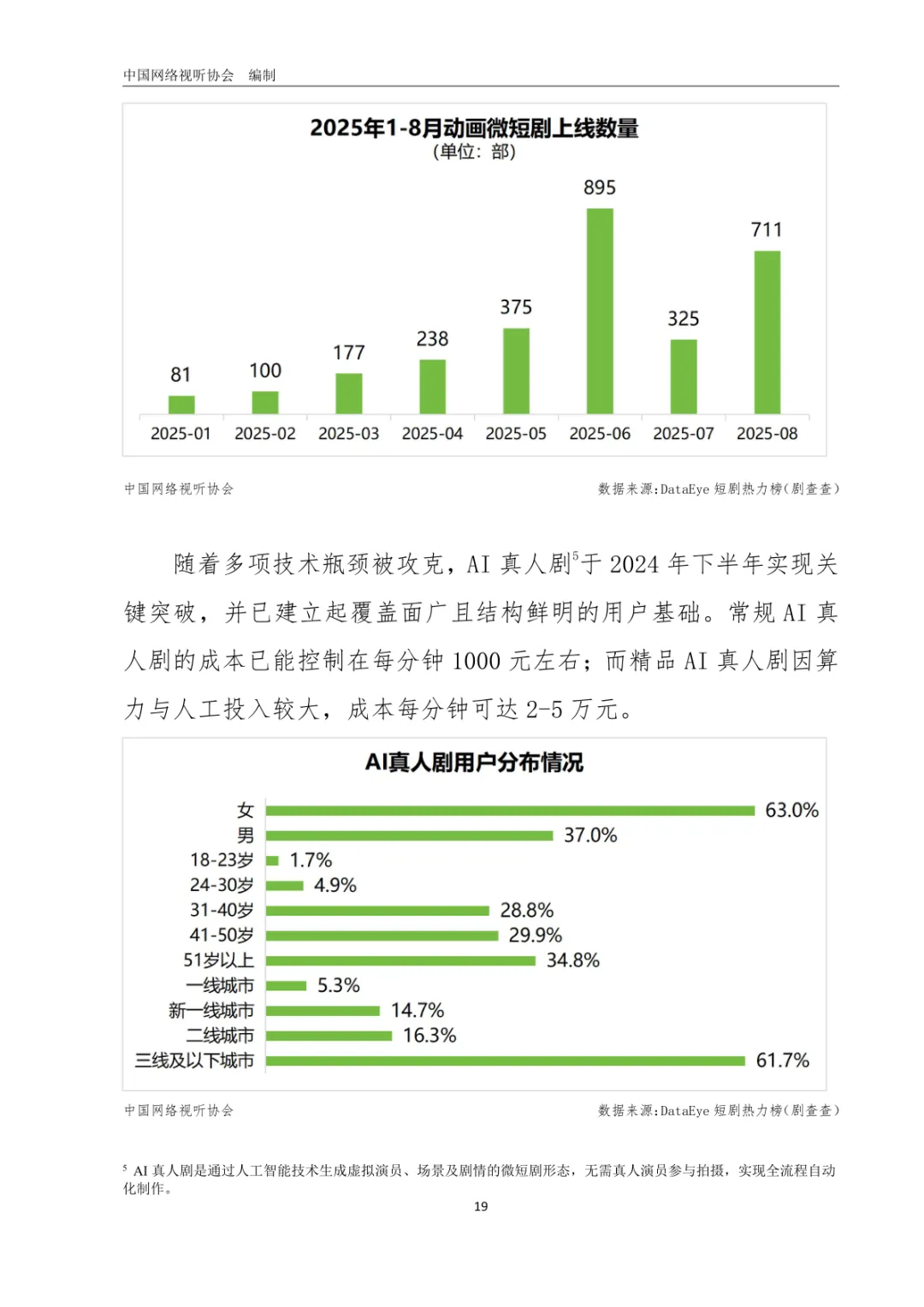 导读:报告以 “新大众文艺” 为视角,从产业、内容、商业、技术、海外五大维度,系统梳理 2025 年微短剧行业发展新趋势。行业呈现品质化转型态势,政策引导与行业自律双管齐下,推动微短剧从数量扩张向质量提升跨越。2025 年 1-8 月,横屏微短剧上线量同比增长 24.52%,普通剧集制作成本普遍上涨至 40-70 万元 / 部,系列化开发与多屏播出成为长尾价值挖掘关键。用户粘性持续增强,人均单日使用时长达 120.5 分钟,近半数用户每天必看,行业相关企业超 10 万家。商业模式以免费模式为主导,占比约 66.3%,头部应用占据超 95% 市场份额。AIGC 技术推动创作平权,动画微短剧与 AI 真人剧快速崛起。海外市场表现亮眼,前 8 月营收超 15 亿美元,“新中式” 叙事成为文化出海重要载体。未来,“微短剧 +” 跨界融合与技术创新将持续驱动行业规模化发展。