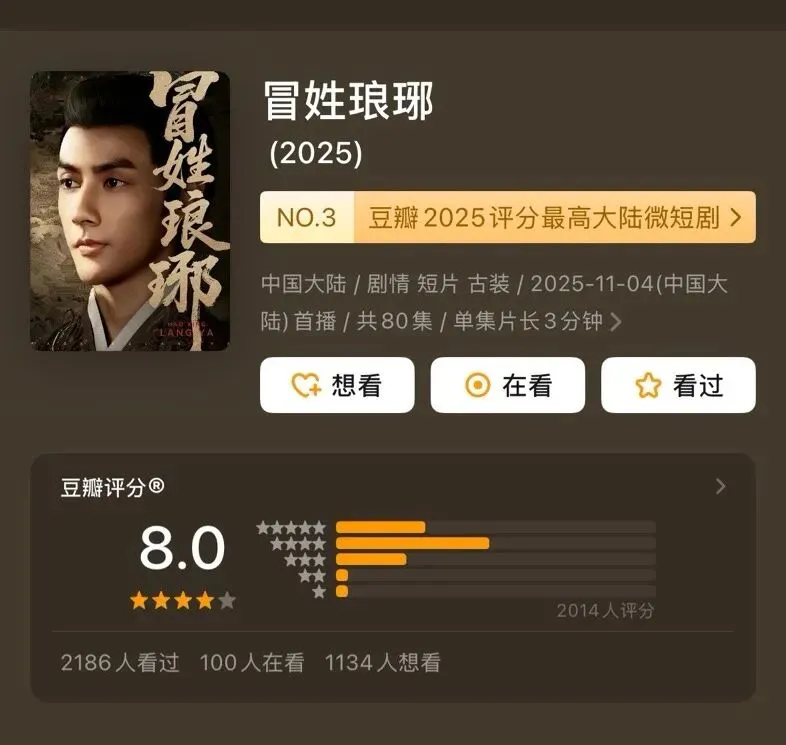 剧中,男主角作为汉语言文学博士,穿越到南齐永明八年,用经学、史学、训诂学等知识“舌战群儒”,传统文化成了最大的“金手指”。观众一边被知识点“暴击”,一边再次对短剧改观。《冒姓琅琊》也以8.0的评分,成为豆瓣2025年评分最高短剧。
