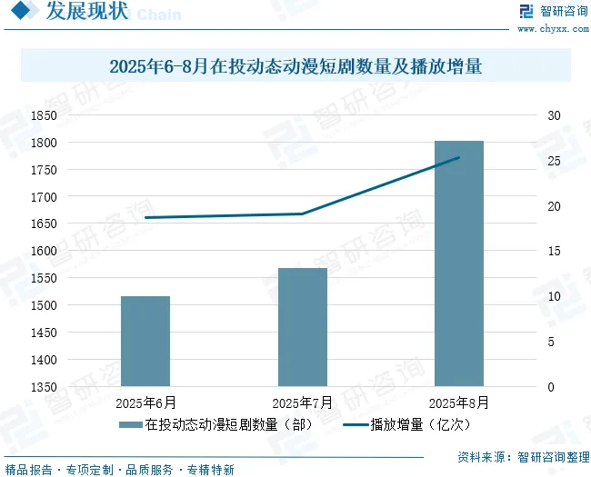 从市场供需两端来看,动漫短剧行业均呈现出强劲的增长态势。供给端方面,2025年6-8月在投动态动漫短剧数量持续攀升,8月达到1802部,环比增长15%,创下历史新高。需求侧同样表现活跃,动态动漫短剧播放增量同步持续增长,其中8月播放增量达25.24亿次,环比增长32%,播放总量已突破95亿次。