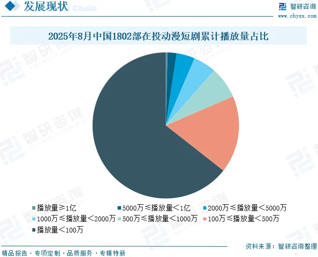 从2025年8月1802部在投动态动漫短剧的播放量分布来看,市场呈现出明显的结构性分化。其中播放量突破1亿次的头部作品仅8部,占比0.4%;达到5000万次以上的作品46部,占比2.6%;超过1000万次的作品213部,占比12%;而约有64%的作品累计播放量不足100万次。