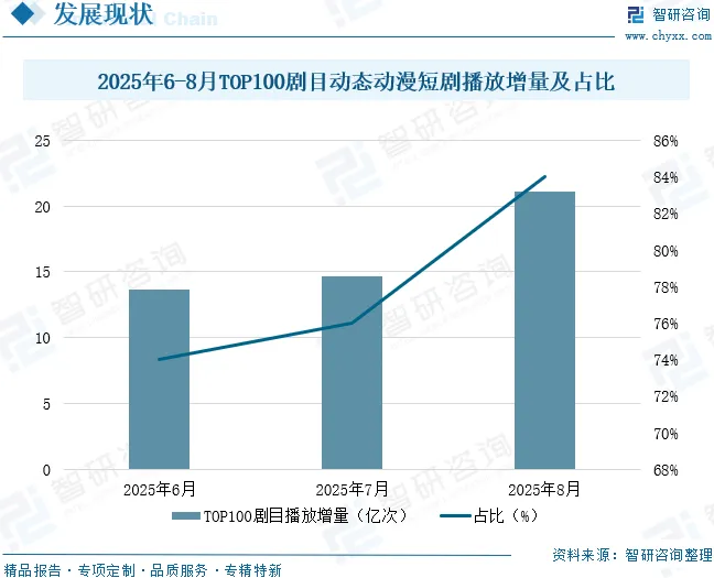动态动漫短剧市场的流量集中化趋势日益显著。2025年6月至8月期间,播放量TOP100的头部作品持续贡献了市场绝大部分流量,且其市场份额呈现逐月提升的态势。以8月数据为例,当月TOP100作品的播放增量达到21.11亿次,在全月总播放增量中的占比超过80%,充分显示出优质内容资源正在加速向头部作品聚集。