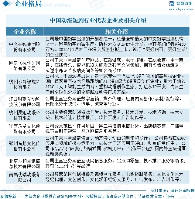 中国动漫短剧行业已形成多元主体竞合发展的市场格局,主要由内容平台、技术开发商与专业制作机构三类核心力量共同驱动。综合型数字阅读企业依托其IP储备与内容分发生态,在IP转化与跨媒介运营上构建起核心优势;科技公司则凭借人工智能生成、引擎动画等交互技术,为行业提供创新的内容生产工具与解决方案;而垂直领域的内容工作室则专注于特定动画风格或细分题材的深度开发,以鲜明的艺术特色和稳定的内容输出在市场中占据一席之地。当前,中国动漫短剧行业代表企业主要包括中文在线集团股份有限公司、网易(杭州)网络有限公司、杭州水母智能科技有限公司、江西时刻互动科技股份有限公司、杭州灵矩动漫科技有限公司、江西瓜酱文化传媒有限公司、郑州奇想文化传播有限公司、北京友和卓谊信息技术有限公司、南昌优瑞动漫有限公司等。其中,2025年上半年,中文在线产出AI动漫短剧超百部,单部成本显著降低;2025年7月份,网易羚羊官方微信发布漫剧代投招募公告,正式宣告入局动漫短剧代投领域。