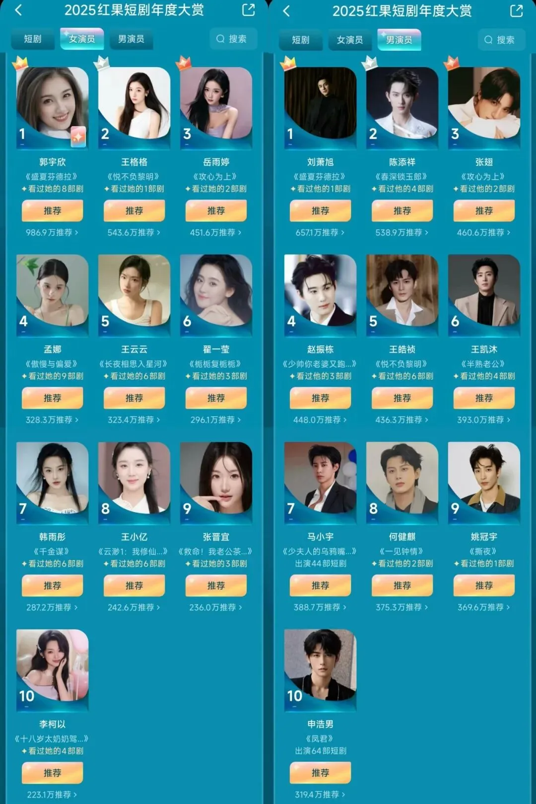 🌟 王格格后期冲得很猛,拿下演员榜第二,她的短剧《悦不负黎明》也位列短剧第七,搭档王皓祯表现同样亮眼,排在演员榜第五。