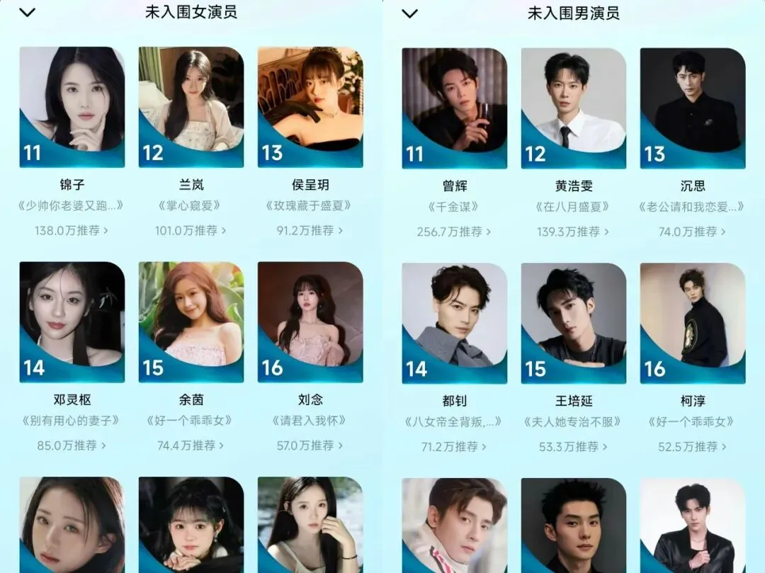 值得一提的是,他和岳雨婷的CP热度一直很高,出圈作品也不少,比如《蔷薇花谢即归来》《双面权臣暗恋我》,但这次没有一部剧进入前100名——演员排名靠前,剧却未上榜,确实有点意思。