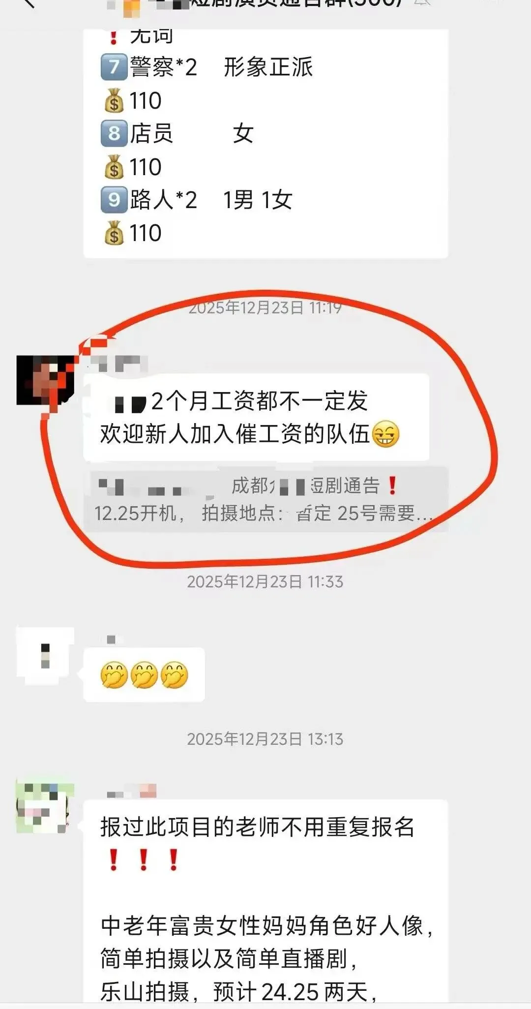 不光是有角色的演员,对于群演来说,欠薪事件也偶有发生,记者在成都某短剧演员群里发现,就在半个月前,便有人在某影视公司的演员征集信息中评论,“(该公司)2个月工资都不一定发,欢迎新人加入催工资的队伍。”或是曝光某个剧组介绍人,拿了剧组发给群演的工资,却迟迟不结账,甚至消失跑路。