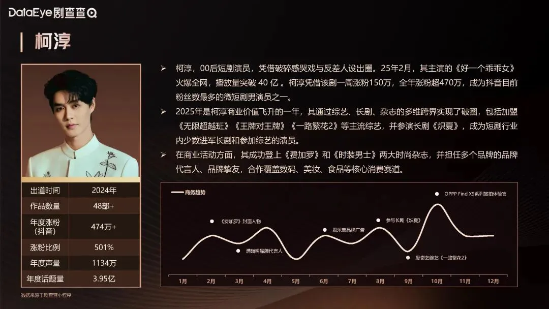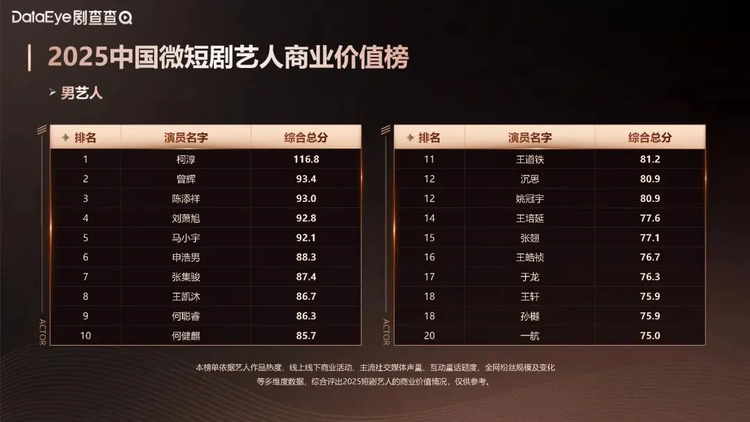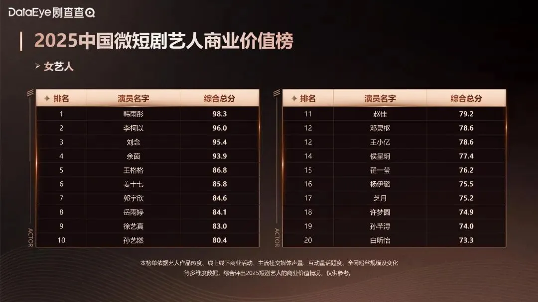 近日,DataEye剧查查发布《2025中国微短剧艺人商业价值报告》,来看下哪些短剧演员在2025年凭自身实力跻身商业价值榜单前列?