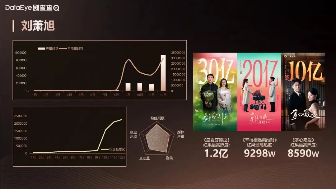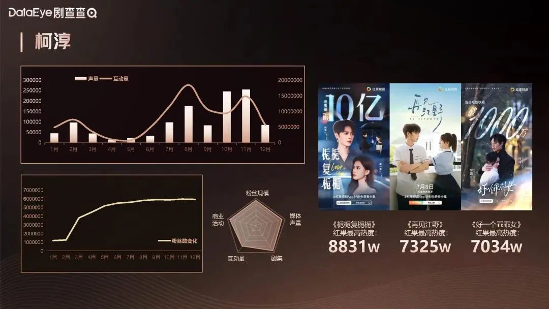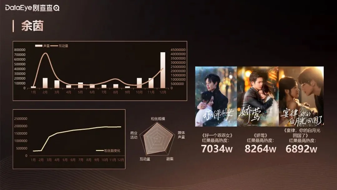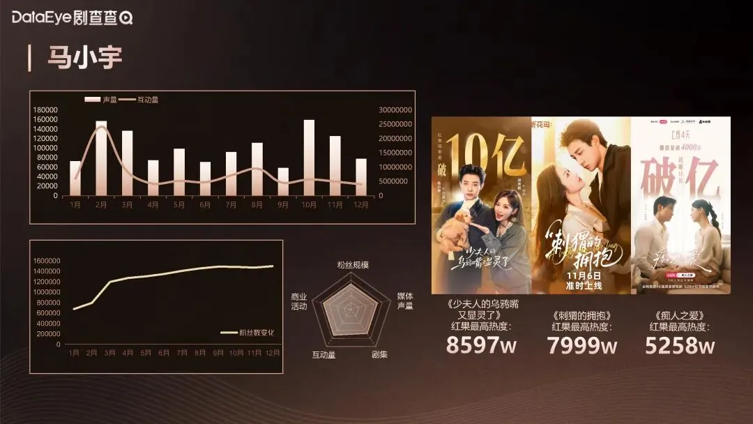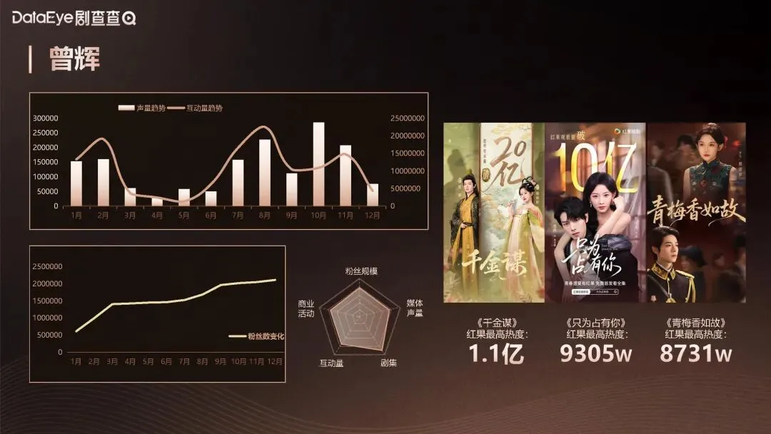 曾辉2025年手握4主演破十亿播放的短剧,这一年除短剧外,也是在综艺、商业等各个领域多面开花,跟韩雨彤的落日雨辉cp更是受到无数人的喜爱。
