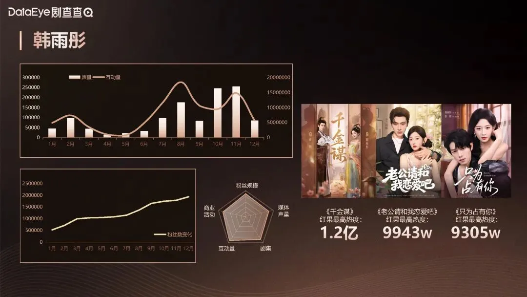 韩雨彤2025年手握7部播放破十亿的作品,可以说是年度爆款短剧最多的女演员了。不论是cp合体剧,还是跟其他演员搭档的剧,都能收获不错的成绩,真正的扛剧大女主!