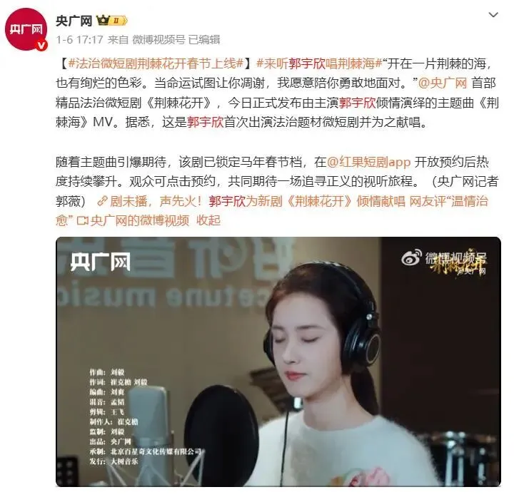 而2026开年最重磅的信号,莫过于郭宇欣拿下央广网首部法制微短剧女一号,这不仅是她个人的升咖,更像是短剧演员获得官方认证的里程碑。