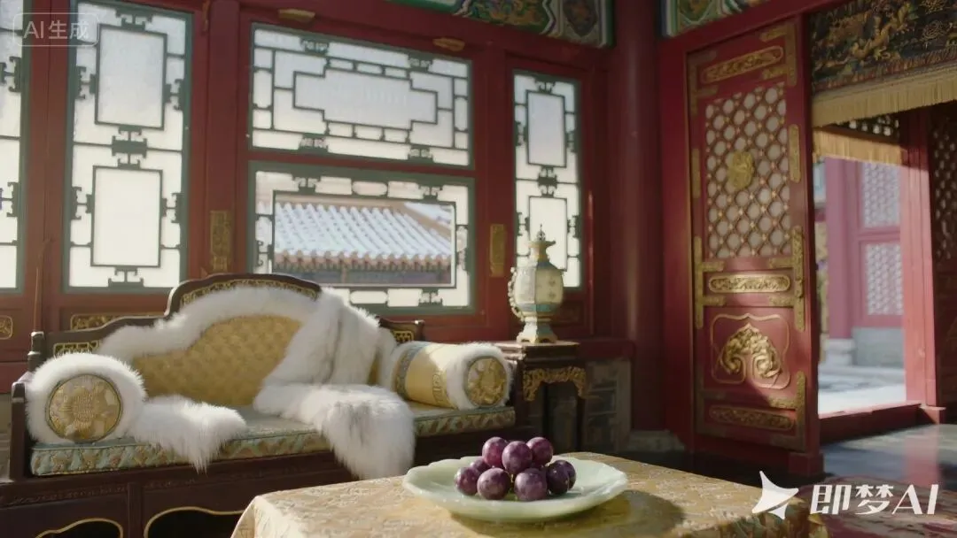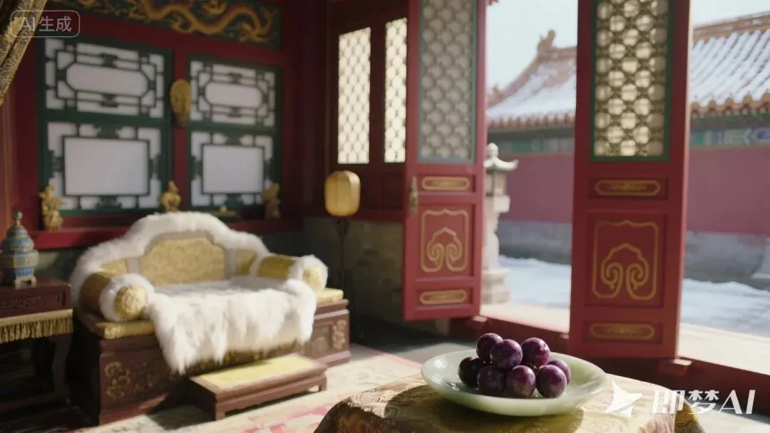 (镜头:全景扫过暖阁,雕花木窗半掩,窗棂雕缠枝莲纹,琉璃瓦上的霜花映着冷白晨光,斜斜落在铺着白狐裘的软榻上;铜制香炉袅袅升起龙涎香青烟,烛火在风口微微晃动,照亮榻边小几上的玉碟(内盛数颗紫葡萄)与摊开的诗集(页脚折痕对准“长相思,在长安”)