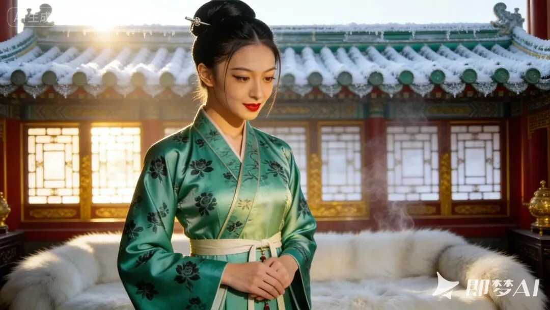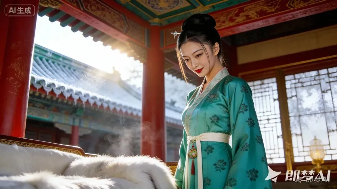 (镜头:中景拍摄绿萼取簪的动作——轻步走向妆台(脚步放轻,裙摆不拖地),双手捧起白玉簪(指尖托住簪身,避免触碰簪头),随后特写白玉簪(簪身莹白,簪头刻小巧兰草纹,纹路清晰带温润光泽),最后镜头聚焦郑贵妃簪发的动作(指尖抚过簪身的细腻触感,眼底情绪稍缓))