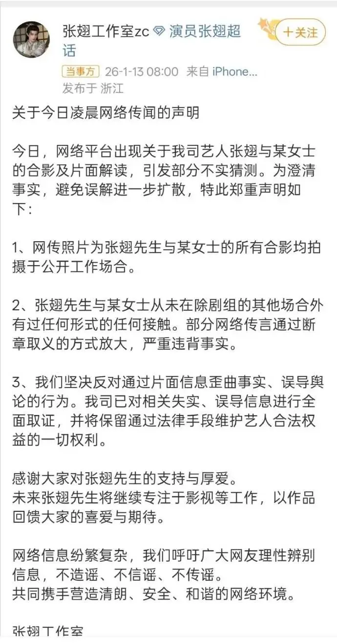 谁料天刚亮,张翅工作室就甩来一纸声明:除拍戏,零接触!措辞硬到能当板砖,还附赠“律师函正在路上”。