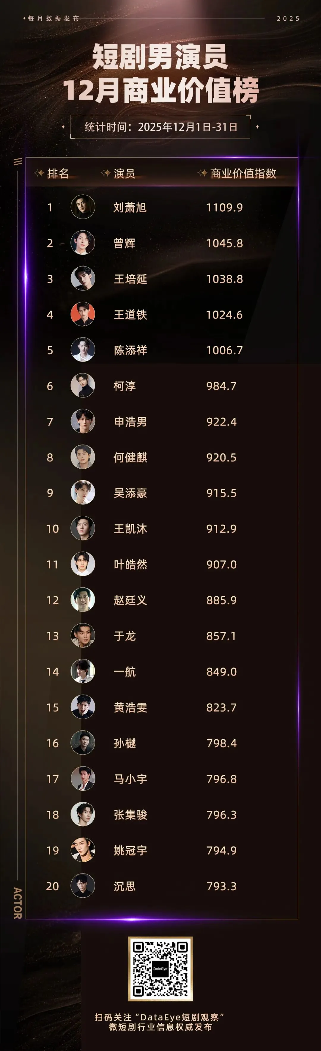 DataEye研究院综合短剧艺人社媒账号粉丝量、热播短剧数据、商务合作及跨界活动情况、签约/所属机构情况共四大维度,综合评出月度艺人商业价值榜单TOP20。刘萧旭凭借稳定的商务合作输出与高曝光度,稳居本期商业价值榜单榜首。12月,其商务拓展持续发力,成功解锁毛戈平香水和国民品牌塔斯汀的商务合作,其中在塔斯汀的商务直播中创下了最高在线人数5W+的亮眼成绩;同期,刘萧旭还受邀亮相腾讯星光大赏、国剧盛典、剧查查之夜等行业盛典,持续维持高曝光热度,进一步夯实了商业价值基础。