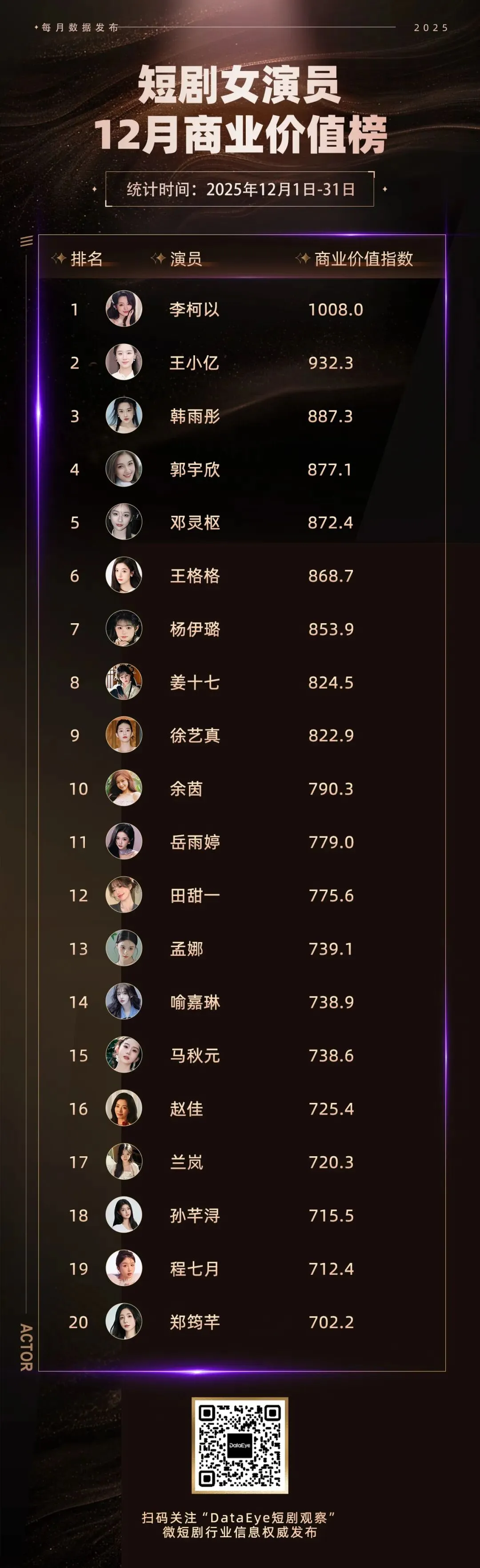 回顾2025年下半年以来的行业趋势,短剧演员的商务合作在数量与质量上均实现显著跃升。这一行业变化背后,一方面得益于短剧赛道观众规模的持续扩容,为演员商业价值释放奠定了基础;另一方面则源于短剧演员整体专业素养与综合实力的提升,获得了品牌方的认可。期待未来短剧演员能持续突破,在商业合作与职业发展上实现更高维度的突破。
