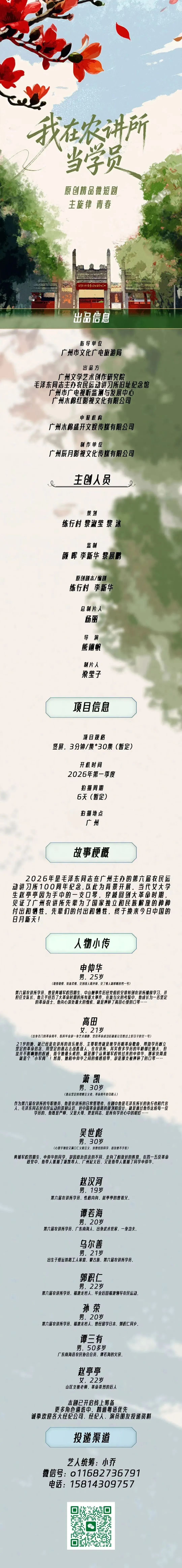 《我在农讲所当学员》将于2026年第一季度在广州开拍,拍摄周期为6天,共30集,每集3分钟左右。目前,该剧已进入紧张的筹备阶段,更多角色选拔与幕后花絮将陆续揭晓。